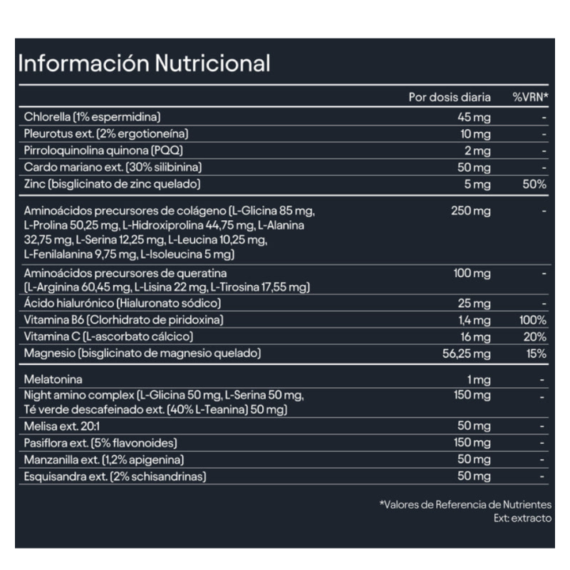 Complemento alimenticio en viales diseñado para la noche que combina aminoácidos, vitaminas, minerales y extractos botánicos para apoyar el descanso y el cuidado capilar.