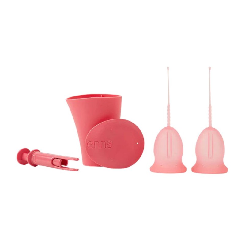 El Enna Cycle Easy Cup Pack incluye 2 copas menstruales talla M, un aplicador reutilizable y una caja esterilizadora (Enna Box). Silicona médica de grado ginecológico, tecnología Easy Removal para extracción sin complicaciones.