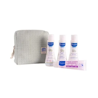 Este neceser de viaje de Mustela está confeccionado en 100 % algodón en Europa, disponible en color beige o menta. Gracias a su diseño amplio y práctico (aprox. 25 × 17 × 7 cm), es perfecto para reunir lo esencial del bebé durante la salida o estancia.