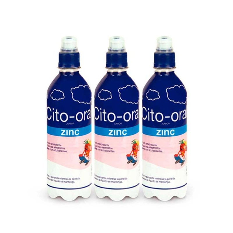 Cito-Oral Junior Zinc es una solución de rehidratación oral formulada específicamente para niños, indicada en casos de pérdida de líquidos por diarrea, vómitos o fiebre. Contiene sales minerales, glucosa y zinc, que ayudan a reponer electrolitos, prevenir la deshidratación y reducir la duración de los episodios diarreicos. Su formato en botella lista para usar resulta cómodo, seguro e ideal para llevar fuera de casa. El pack incluye 3 botellas de 330 ml, con sabor agradable adaptado al público infantil.
