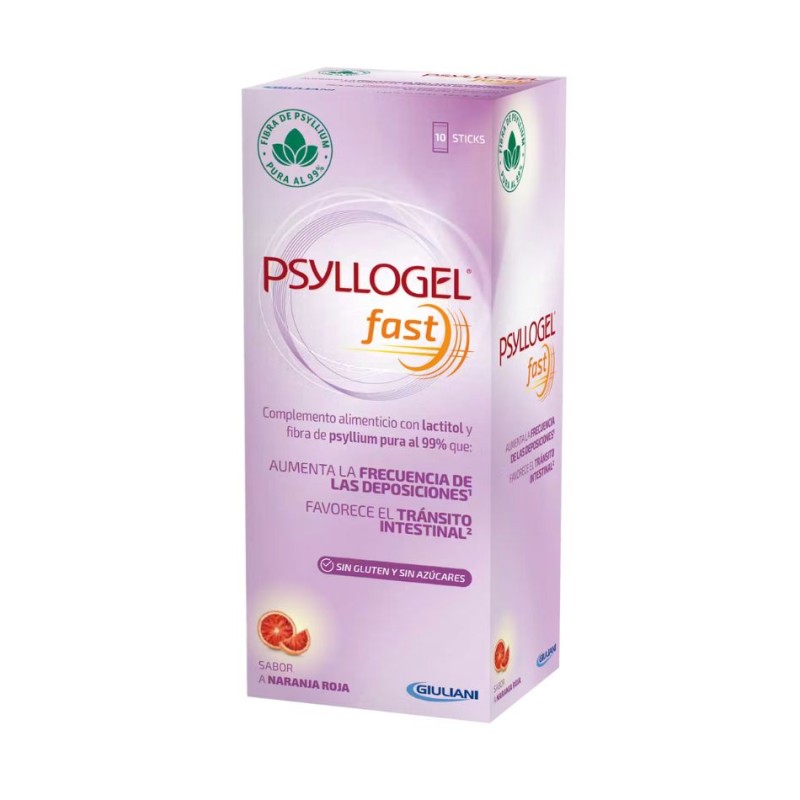 Psyllogel Fast 10 Sticks 14,7 g sabor naranja roja es un complemento alimenticio en formato sticks monodosis con lactitol y fibra de psyllium pura al 99 %, formulado para favorecer la regularidad intestinal, el tránsito intestinal y la formación de heces suaves, con un sabor agradable a naranja roja.