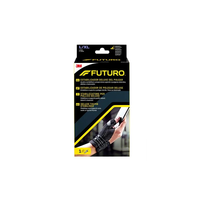 El estabilizador deluxe para dedo pulgar FUTURO™ ofrece una sujeción esencial para tu pulgar, para que puedas centrarte en la tarea que tienes entre manos, tanto si es escribir, un videojuego o trabajos de jardinería. Este estabilizador del pulgar incluye dos soportes de sujeción y se adapta para un ajuste personalizado. Cuando te duele el pulgar, es difícil pensar en otra cosa, así que colócate el estabilizador deluxe para dedo pulgar FUTURO™ para una sujeción extra.