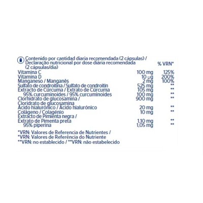 Complemento alimenticio que combina vitaminas como cúrcuma, sulfato de condroitina, colágeno, ácido hialurónico y manganeso, vitaminas especificas para una buena salud articular y conectiva, mejorando la movilidad articular y protegiéndola frente al daño externo.
