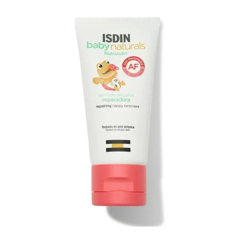 Isdin Baby Naturals Nutraisdin Pomada del Pañal está formulada específicamente para proteger y cuidar la delicada piel del bebé en la zona del pañal. Gracias a su contenido en óxido de zinc (40 %) y pro-vitamina B5, crea una barrera protectora eficaz frente a la humedad y agentes irritantes, al tiempo que favorece la regeneración cutánea. Su fórmula está enriquecida con ingredientes de origen natural (96 %) y ha sido testada dermatológicamente y pediátricamente. Indicada para prevenir y tratar irritaciones leves, rojeces y dermatitis del pañal.