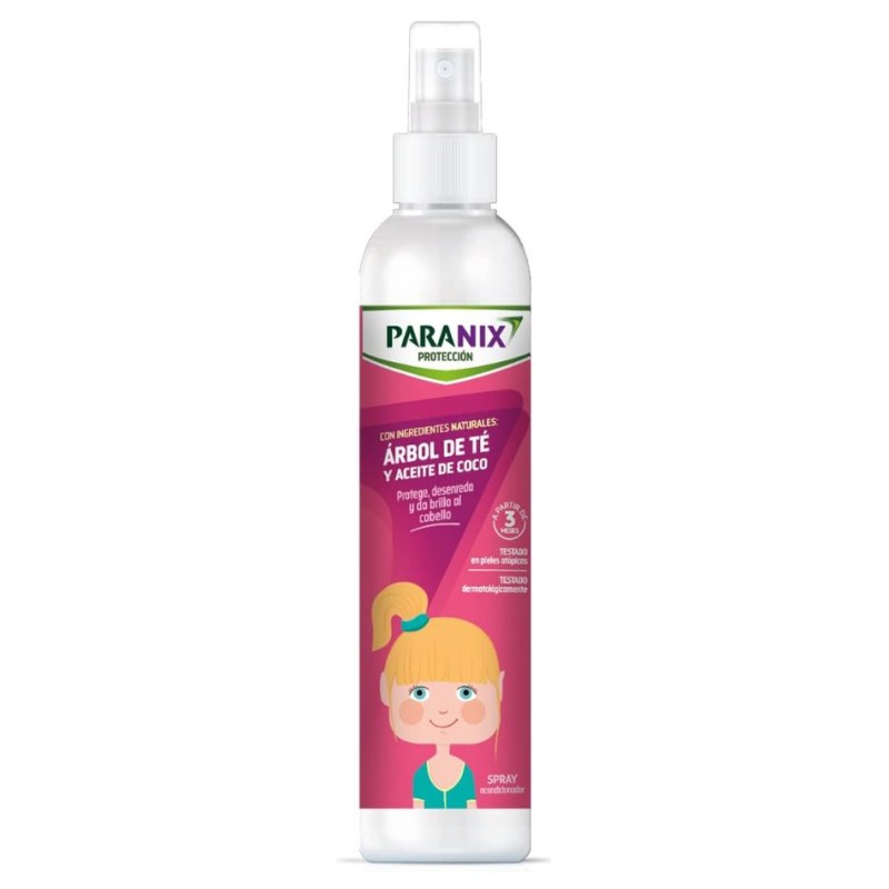Paranix Árbol de Té Niña Spray 250 ml es un spray capilar diseñado para el cuidado y protección del cabello infantil, que facilita el peinado y aporta suavidad y brillo gracias a su fórmula con aceite de árbol de té, aceite de coco y dimeticona.
