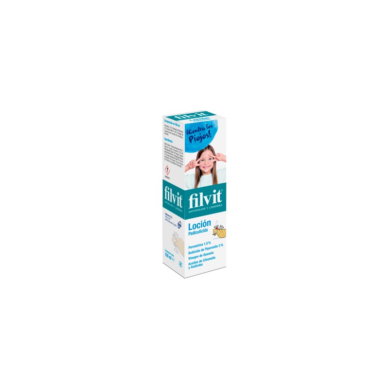 Filvit Loción Pediculicida 100 ml es un tratamiento eficaz contra la infestación por piojos y liendres, formulado con ingredientes activos que actúan eliminando los parásitos en pocas horas. Está indicado para adultos y niños a partir de 2 años de edad, proporcionando una acción rápida y segura.