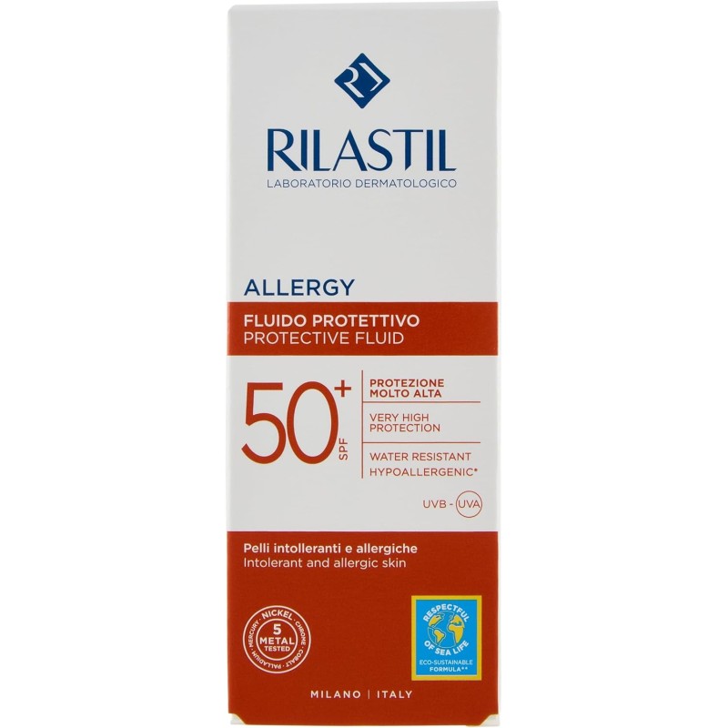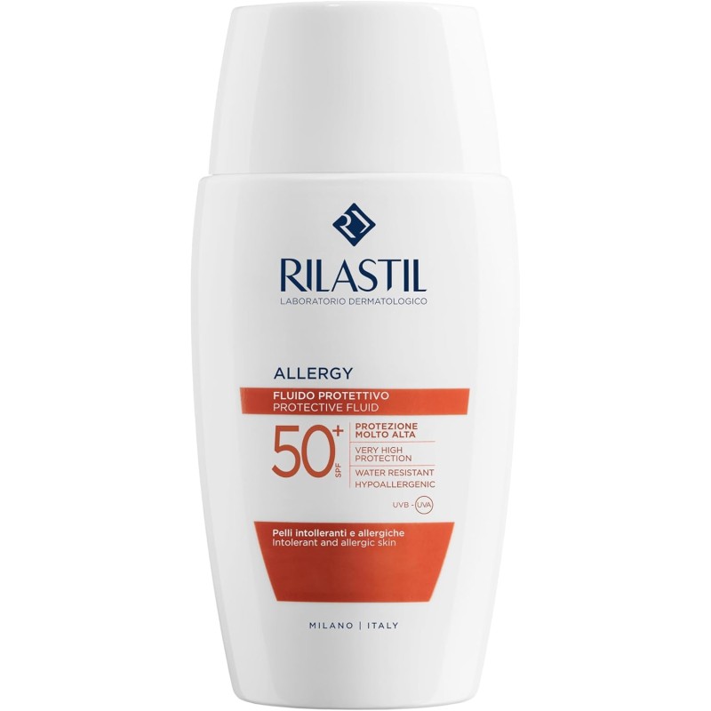 Rilastil Allergy Fluido Protectivo SPF 50+ es un fotoprotector especialmente diseñado para pieles con tendencia alérgica, reactivas o hipersensibles. Su fórmula sin filtros químicos, sin perfume y sin alcohol ofrece una protección solar muy alta frente a los rayos UVA y UVB, minimizando el riesgo de irritaciones o reacciones adversas. Textura ligera, fluida y de fácil absorción. Apto para adultos, niños y pieles atópicas.
