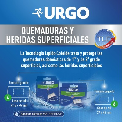 URGO Quemaduras y Heridas superficiales son apósitos listos para usar, en sobre individual (pequeño y grande) y de uso único, compuestos por un soporte flexible y confortable, y una compresa que permite la absorción óptima de los exudados.