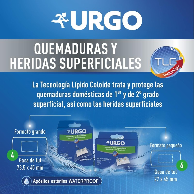 Reservado al tratamiento de las heridas locales cuyo tamaño no supere el tamaño de un apósito. En las quemaduras extensas, es deseable que el apósito supere ampliamente su superficie para que pueda absorber los exudados. Si no experimenta ninguna mejora de la cicatrización al cabo de 6 días, consulte con su médico. Consulte a su farmacéutico o medico en caso de quemadura en niños. En presencia de signos clínicos de infección local (las rojeces se exteinden a la piel no lesionada, dolor, etc.) o cuerpos extraños en la herida, sangrado abundante, cualquier objeto afilado y/o sucio, consulte con su farmacéutico o su médico. El apósito URGO Quemaduras y Heridas superficiales debe utilizarse inmediatamente después de abrir el sobre. Almacenar en un lugar protegido del calor, de la luz y de la humedad. La parafina puede ser absorbida por los apósitos, la ropa y/o la ropa de cama y prende muy rápidamente. Cualquier persona que use o aplique un producto sanitario dermatológico que contenga parafina debe mantenerse lejos del juego hasta que la piel y/o la ropa de cama que ha estado en contacto con la piel se hayan limpiado adecuadamente.