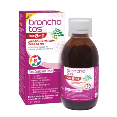 Bronchotos Max 8 en 1 es un jarabe de acción múltiple indicado en casos de tos seca y productiva asociada a resfriados. Su fórmula combina ingredientes naturales como malvavisco, musgo de Islandia y ácido hialurónico. Proporciona alivio rápido, protege la mucosa y favorece la hidratación de las vías respiratorias superiores. Adecuado para adultos y mayores de 12 años.