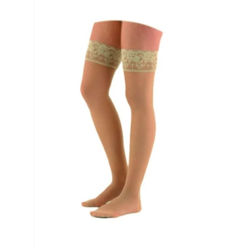 Media largas Varisan Blonda 140 DEN de compresión normal, con elegante banda de silicona decorativa, ideales para mejorar la circulación y prevenir molestias venosas leves. Talla 3, color visone, 1 media.