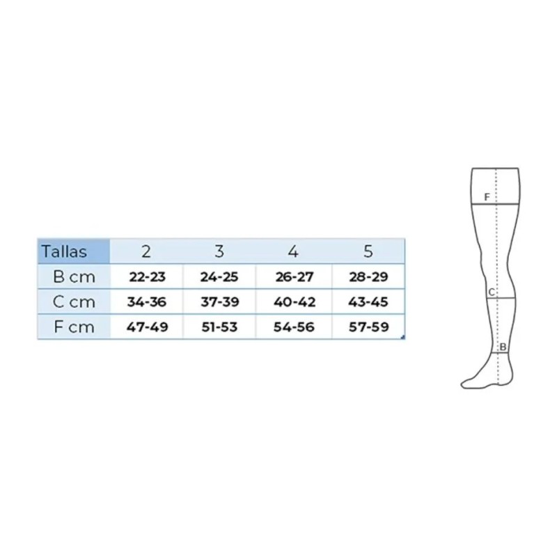 La Media Larga (A-F) Blonda Varisan 140 DEN con compresión normal está diseñada para proporcionar una presión graduada y calibrada, favoreciendo el retorno venoso y aliviando síntomas como piernas cansadas, hinchazón leve o varices incipientes.