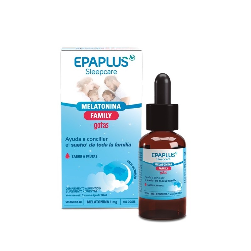 Epaplus Sleepcare Melatonina Family Gotas es un complemento alimenticio a base de melatonina y vitamina B6. Para el sueño de toda la familia. Su sabor a frutas es apto para adultos y niños. 4 gotas, equivalen a 1 mg de melatonina, cantidad necesaria para ayudar a disminuir el tiempo de conciliación del sueño. Su contenido en vitamina B6, ayuda a disminuir el cansancio y la fatiga.
